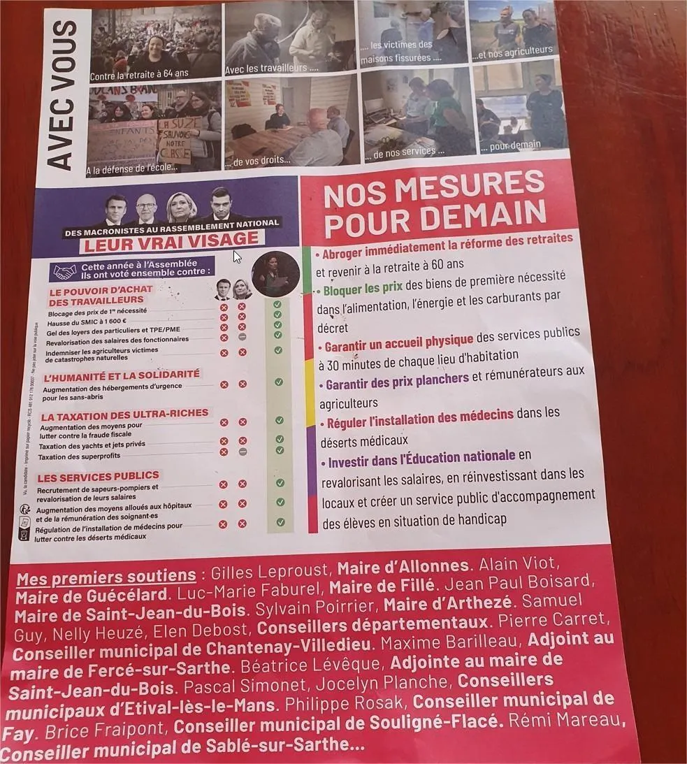 L’erreur a fait bondir le maire de Chantenay-Villedieu : sur les tracts électoraux arrivés dans les boîtes aux lettres, la candidate aux législatives 2024 dans la 4e circonscription de la Sarthe Élise Leboucher, fait mention de ses premiers soutiens. Parmi eux,  Pierre Carret, conseiller municipal de Chantenay-VilledieuÂ