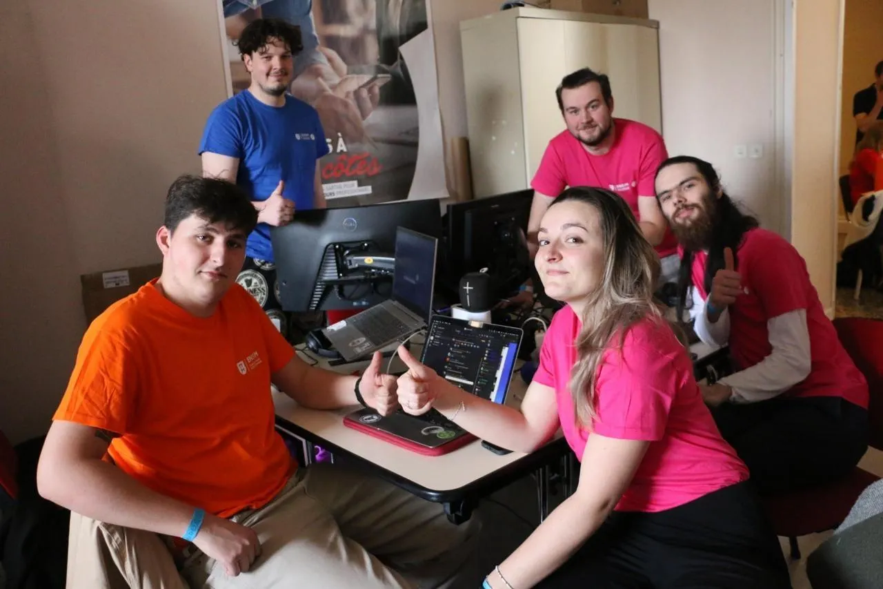 Éliott, Marcelin, Clara, Arthur et Pierre-Louis forment l’une des équipes de l’Ensim engagées dans les 24 Heures du code, défi réunissant étudiants et professionnels dans une compétition amicale autour de la programmation informatique. © Ouest-France