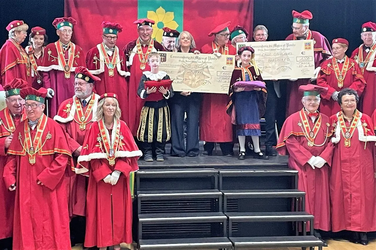 Deux chèques ont été remis par la confrérie des Anysetiers : un de 5 000 € à Magie à l’hôpital, un de 1 500 € à Beelinked, lors du 65e chapitre magistral. © Le Maine Libre