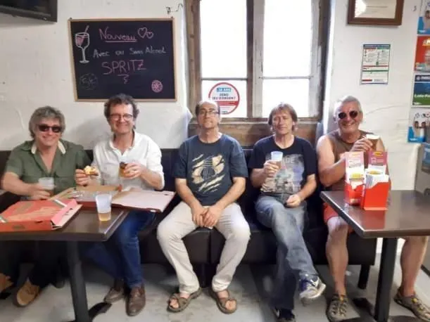 La bande des Copains de la Lune, prenant des forces juste avant l’une de ses prestations en Sarthe. © Photo archives Le Maine Libre