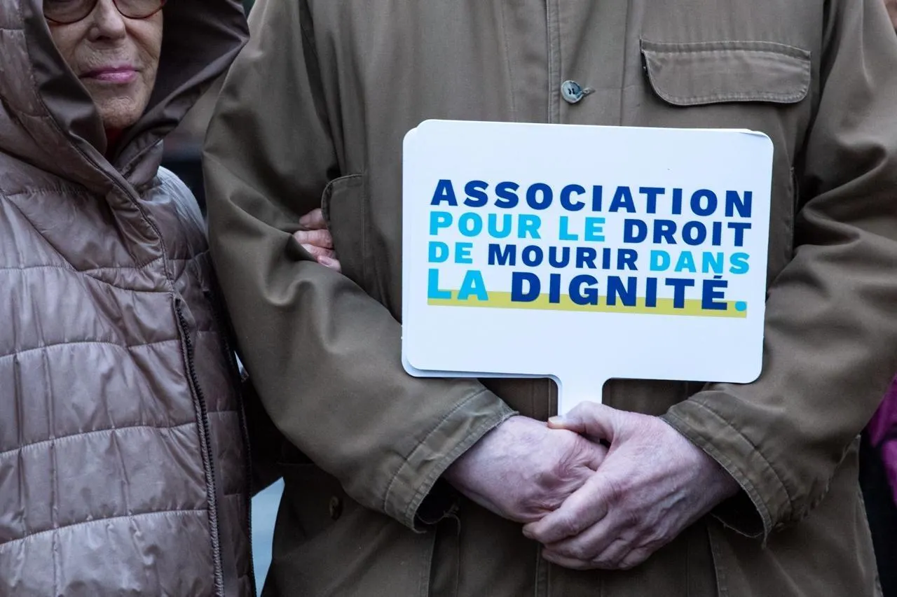 Un rassemblement des militants de l’Association pour le droit de mourir dans la dignité, en 2023 à Paris. © Valérie Dubois / Hans Lucas via AFP