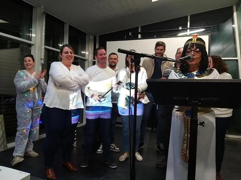 Eve Sans, maire d’Arnage (Sarthe), au micro, déguisée en Cléopâtre, a rendu les clefs de la ville à la bande victorieuse de l’année dernière : les Villainous. © Ouest-France