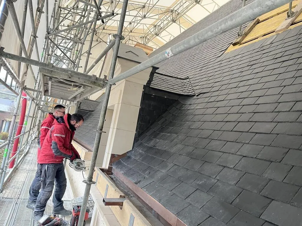 Une charpente entièrement en chêne, des ardoises aussi épaisses que des huîtres, des pierres de taille, des cheneaux et des clous en cuivre : sur les hauteurs du château de Sillé-le-Guillaume, les artisans travaillent pour le prochain siècle.