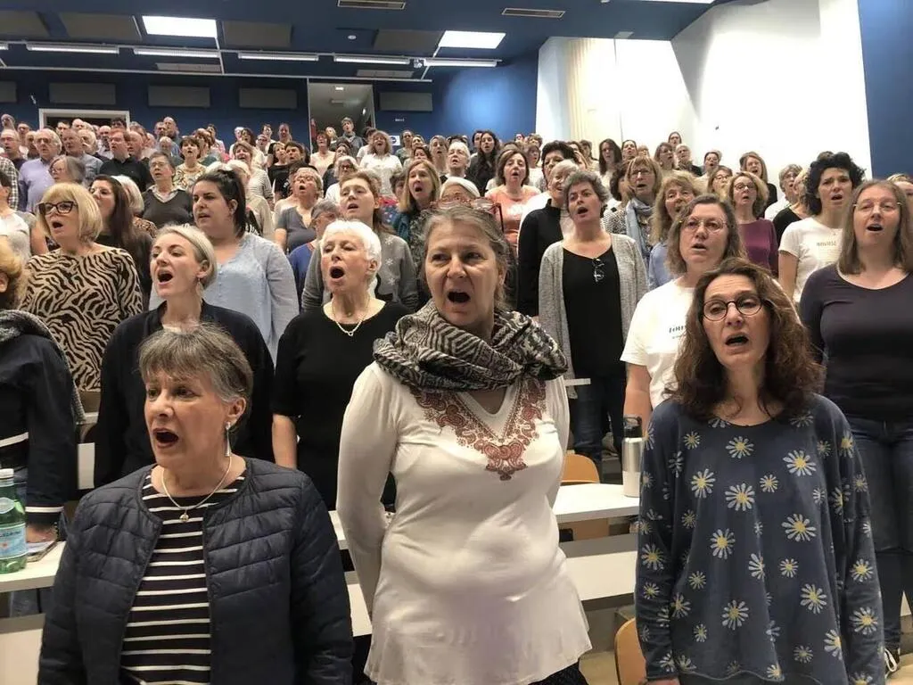 Lors des répétitions de 400 voix pour Queen, les choristes sarthois femmes et hommes chantent à l’amphithéâtre de l’Université du Mans. © Ouest-France