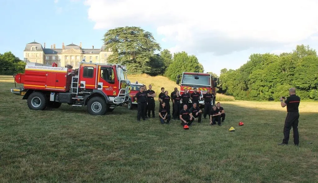 Une scène insolite s’est déroulée dans le parc du château de Sablé-sur-Sarthe, vendredi 23 mai 2025 : les pompiers sont arrivés avec plusieurs camions-citernes contre les feux de forêts, non pas pour maîtriser un incendie, mais pour une petite séance photo en vue de leur calendrier.