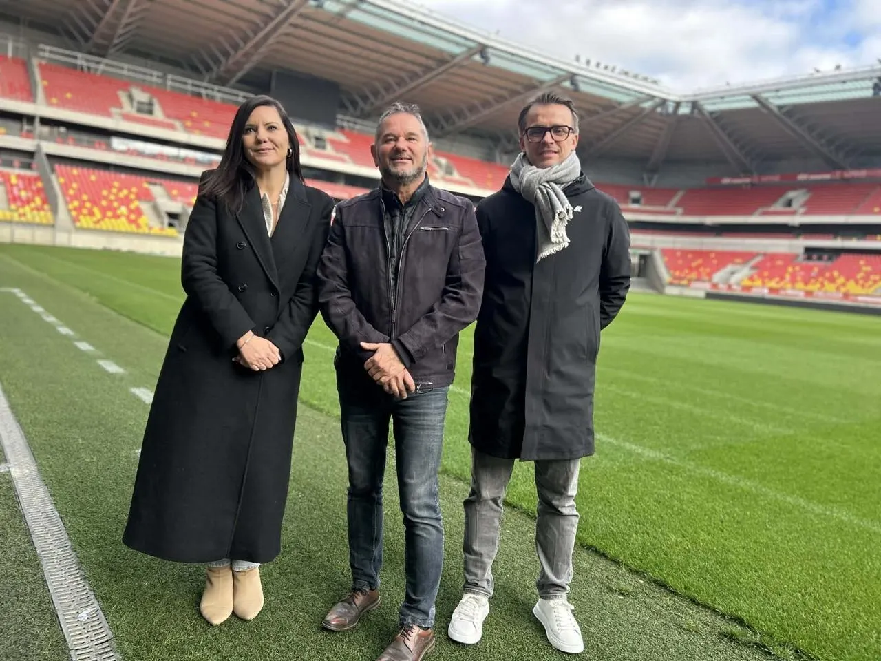 Émeline Falempin, présidente de l’association solidaire Un regard, un sourire, un toit, qui organise une nouvelle fois le Noël des sans-abri au stade Marie-Marvingt, ici à côté de Jean-Luc Catanzaro, à l’origine de cette opération solidaire, et Yannick Hoinville, directeur général du stade. © Le Maine Libre