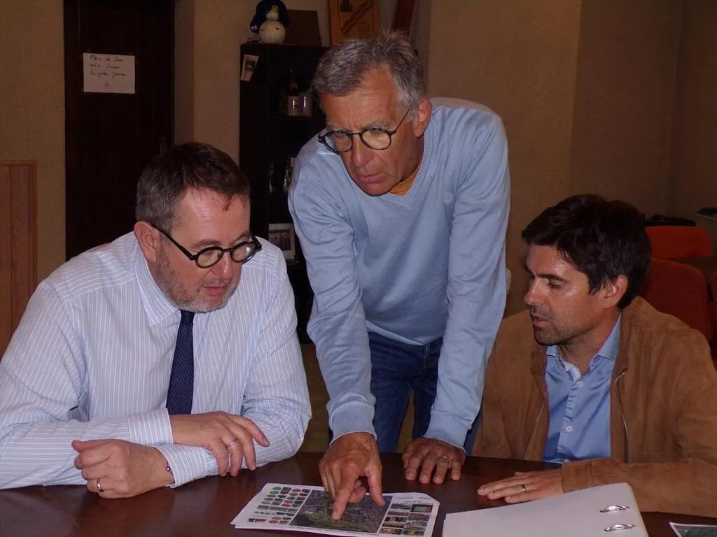 Yves-Marie Hervé, Michel Humeau et Florent Breneteau supervisent les derniers éléments de l’aménagement de la coulée verte. © Le Maine Libre