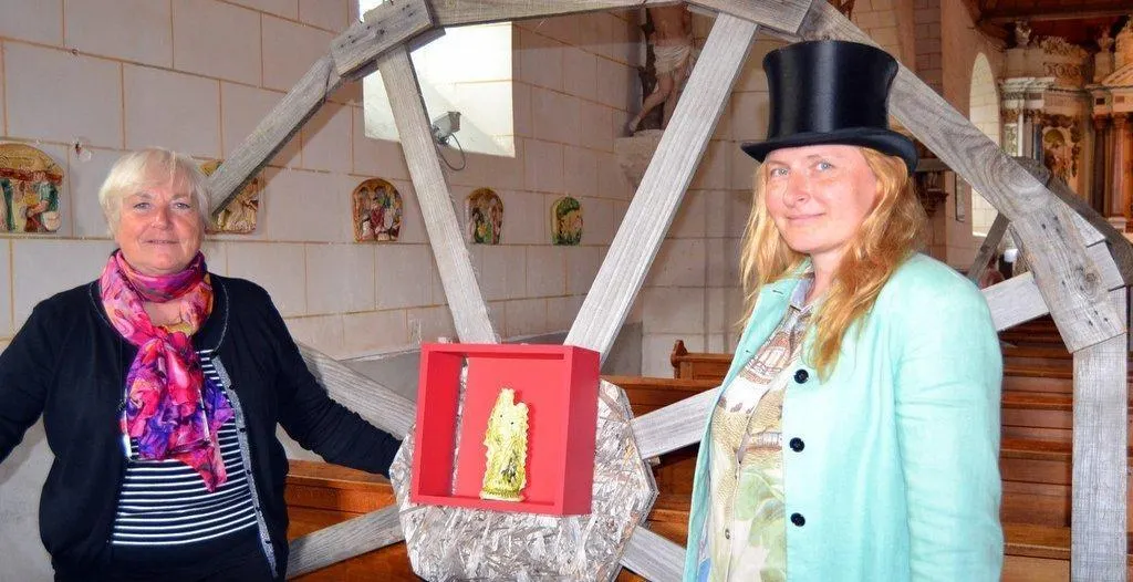 Brigitte Vaidis et Zoïa Skoropadenko dans l’église de Ligron entourant une statuette « en Ligron ». © Le Maine Libre