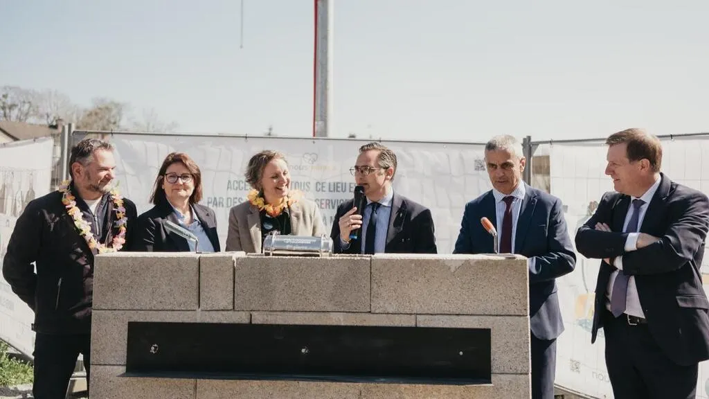 Amandine Maubert, directrice déléguée de Nous-Mêmes, à la droite de Nicolas Leudière, le maire de Sablé-sur-Sarthe, a scellé la première pierre de la résidence inclusive qui sera implantée rue de Fleury-sur-Orne et dont la livraison est prévue en février 2026. © Thomas Brousmiche/Oui Care