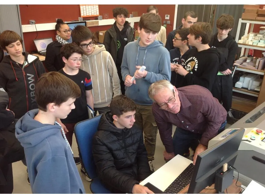 Des élèves de Nazareth découvrent la machine d’impression laser au laboratoire de fabrication. © Le Maine Libre