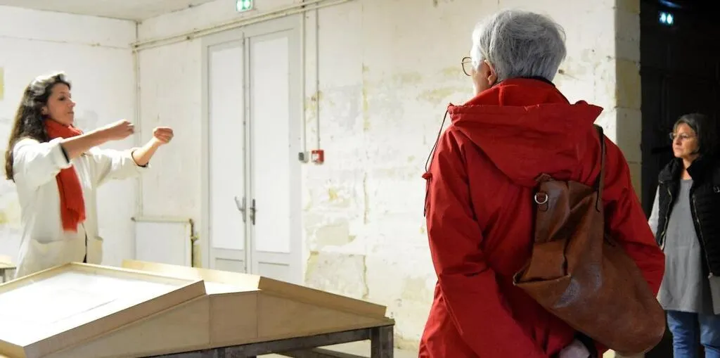 Aux Moulins de Paillard, Shelly de Vito explique aux visiteurs la notion du temps qui s’étire dans la salle des dessins de quadrants solaires. © Ouest-France