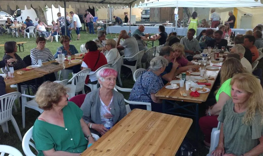 Une centaine de personnes se sont attablées samedi en soirée à l’entrée des moulins de Paillard. © Le Maine Libre