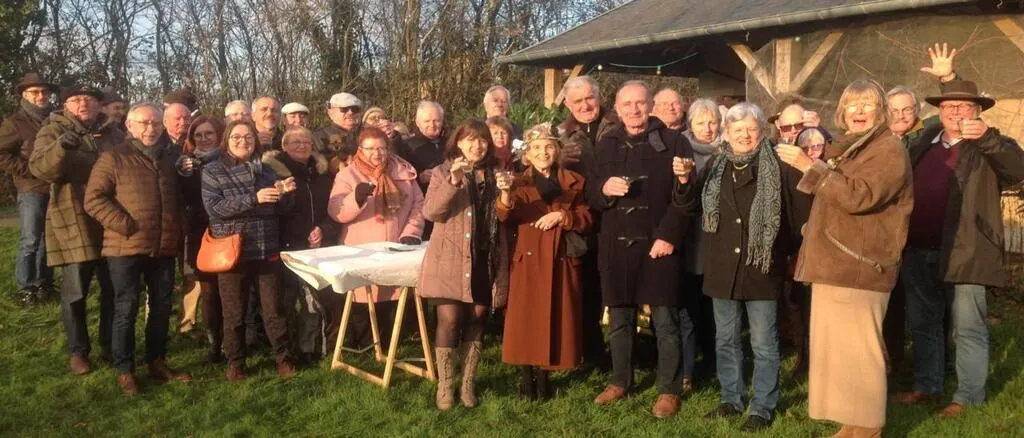 À la cave de Jannick et Gérard Oger : au centre, portant couronne, Annick Lefèvre, entourée d’Aimée Trumeau, adjointe de Loir-en-Vallée, et du dauphin Jean-Claude André (en duffle-coat). © Le Maine Libre