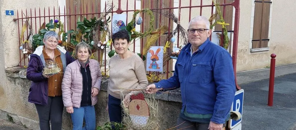 Autour de Xavier le « monsieur vert » de la commune, Sylvie, Caroline et aussi Josette Trémier, la maire adjointe ont installé la nouvelle décoration de Pâques sur les grilles devant la salle communale. La récupération d’objets divers a fonctionné de nouveau : coquilles d’œufs, branchages, dessins coloriés par les enfants ; un nid a également trouvé place dans le tilleul près de la salle des associations. © Le Maine Libre