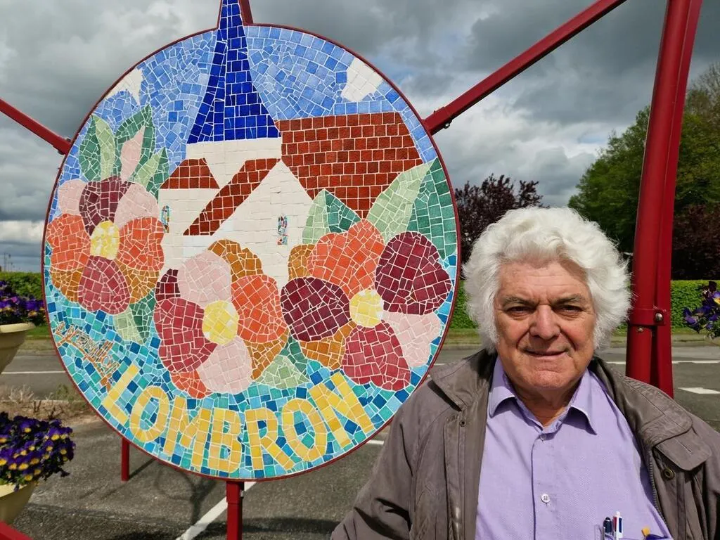 Alain Grémillon devant la mosaïque représentant le logo de Lombron (Sarthe) qu’il a réalisé. © Ouest-France