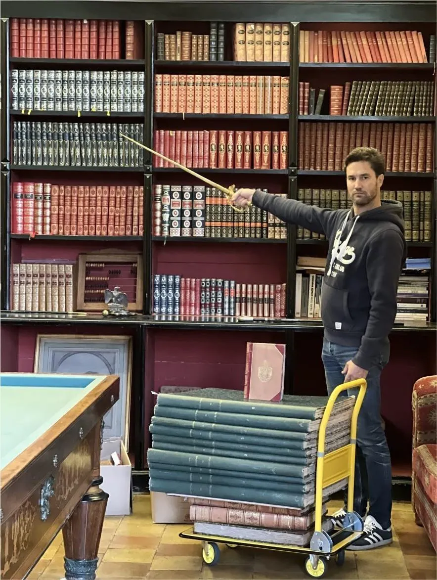 Pierre-Emmannuel Lecot devant la bibliothèque retrouvée, le sabre du général Rey à la main. © Pierre-Emmannuel Lecot