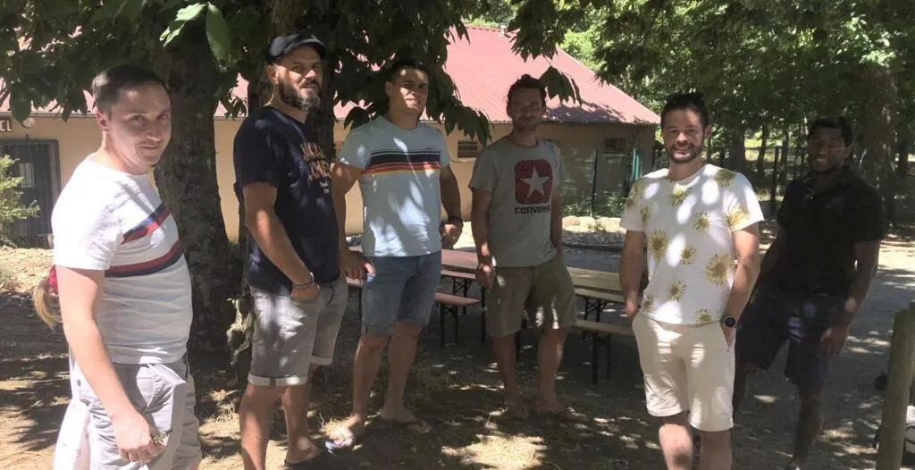 À l’ombre des arbres, une partie de l’équipe de foot à sept locale, autour de T. Esnault, son référent au club. © Le Maine Libre