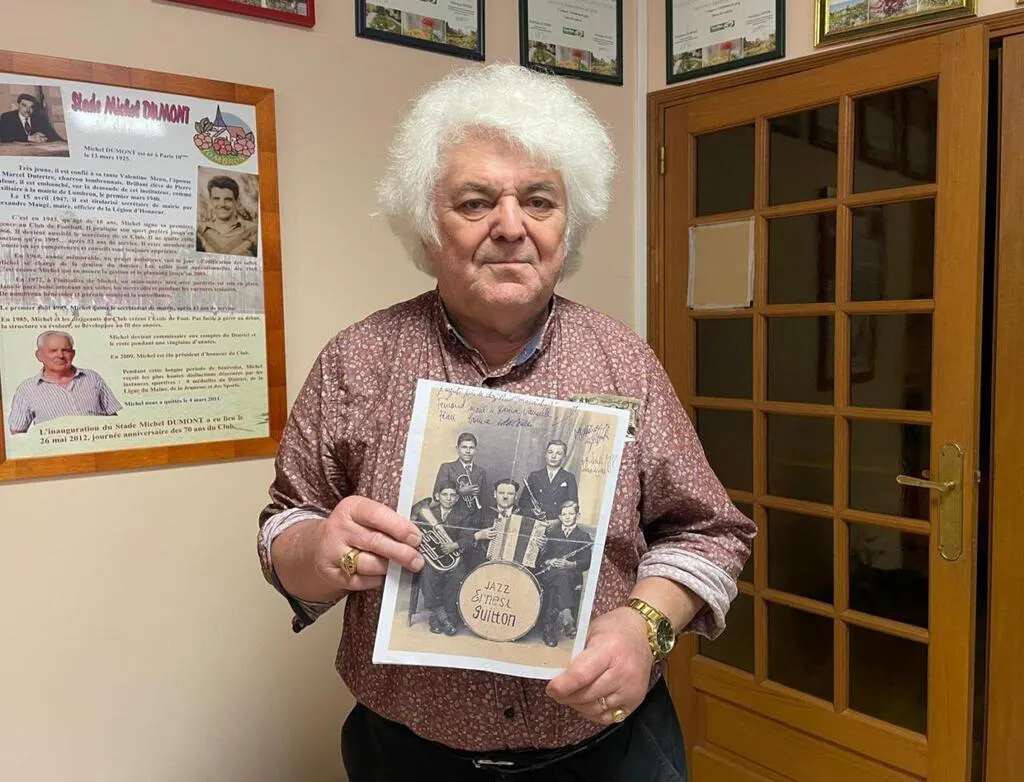 Le maire Alain Grémillon tenant une ancienne photo du groupe de jazz d’Ernest Guitton. © Le Maine Libre