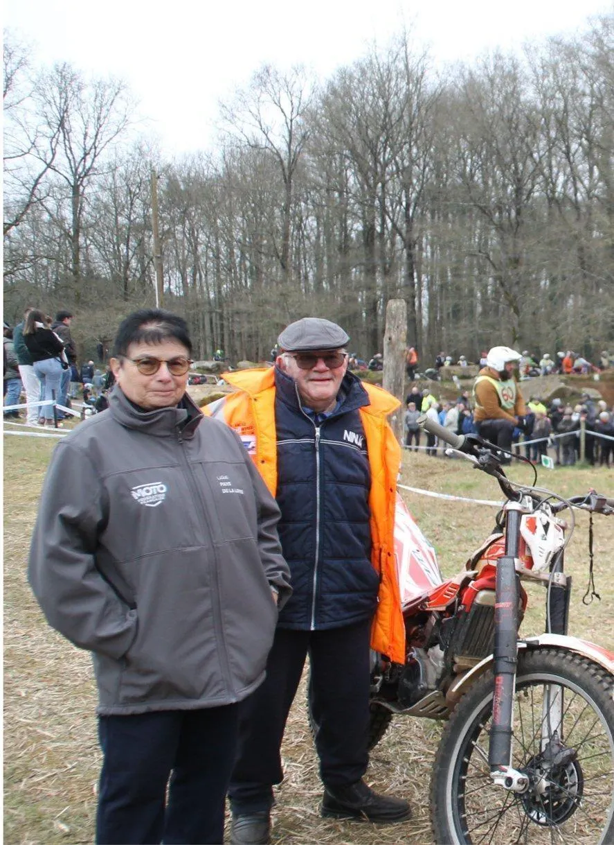 À l’Ascop moto la règle d’or et de respecter et remercier chaleureusement les bénévoles indispensables pour les organisations est devenue une priorité pour le président Jean-Michel Blin et son équipe.  Cette année nous avons décidé de mettre à l’honneur Jeannine et Roger Emery de Teloché licenciés à l’AM Sarthe basée à Ruaudin. Ils prennent de l’âge mais comme la relève n’arrive pas vite ils continuent de nous aider au contrôle d’avant course. C’est précieux et admirable et mon petit-fils Loïs est venu les saluer avec moi car il sait que c’est grâce à ces gens-là qu’on peut organiser notre trial à Lombron et qu’il peut ainsi courirÂ