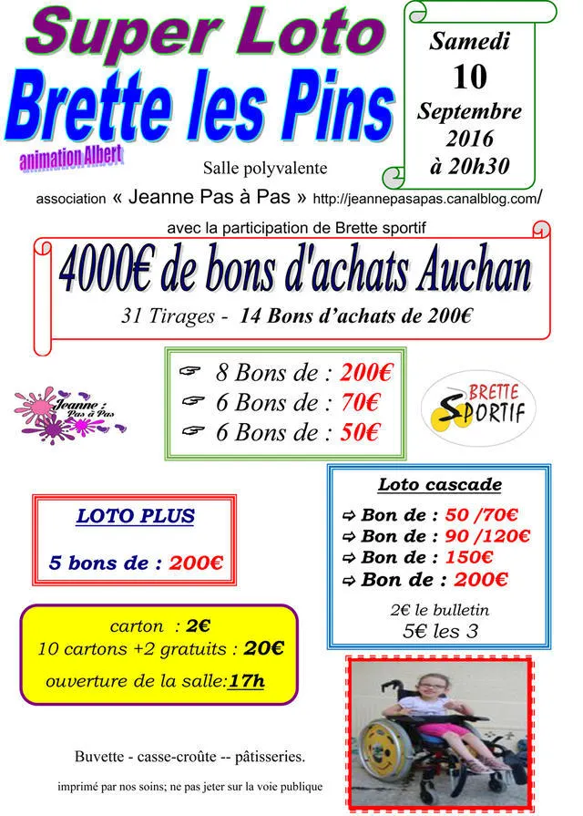 Loto de l'association Jeanne Pas à Pas le 10 septembre 2016 à Brette les Pins... |