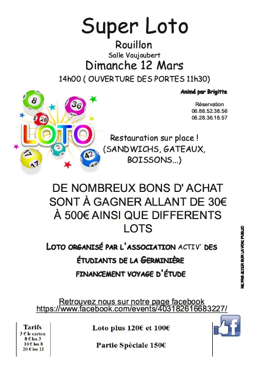 Nous organisons un loto le dimanche après-midi 12 Mars 2017, à la salle Vaujoubert de Rouillon où des bon d'achats allant jusqu'à 500€ ainsi que des lots seront à gagner.