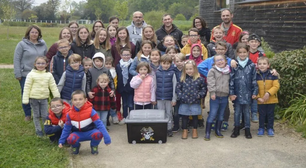 Les enfants de Louailles à l’issue de la chasse aux trésors avec les organisateurs. © Le Maine Libre