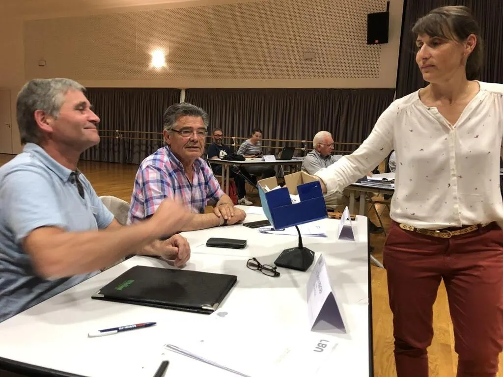 Fin du vote : les maires de Chantenay-Villedieu et Saint-Denis-d’Orques quittent la séance, le mercredi 1er juin 2022 à Brûlon. © Le Maine Libre