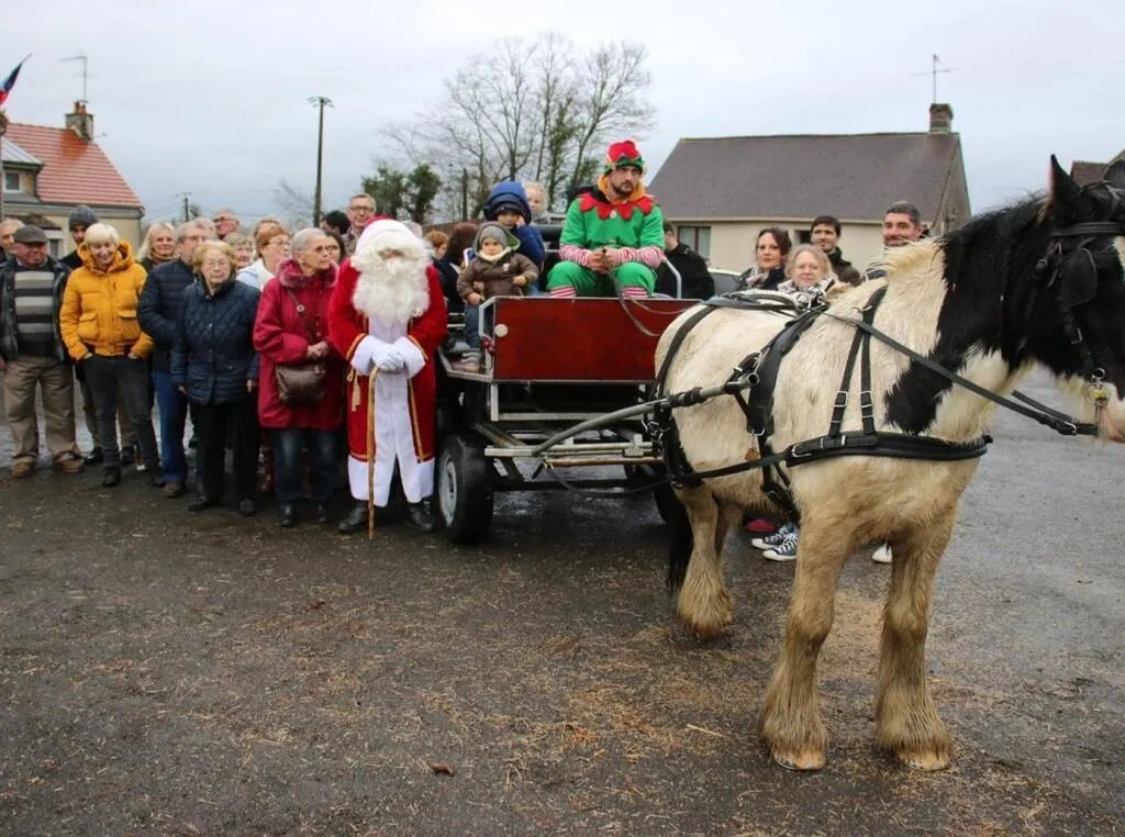 Marc Moreuil, président, du comité des fêtes, accompagné des enfants, des aînés et d’élus, a accueilli le père Noël arrivé à bord d’une calèche tractée par un cheval. Nous allons remettre des friandises et cadeaux à tous les enfants et nous en profitons pour offrir un panier garni de consommables à nos aînés. Un goûter intergénérationnel est préparé et servi par les membres du comité et du conseil municipal