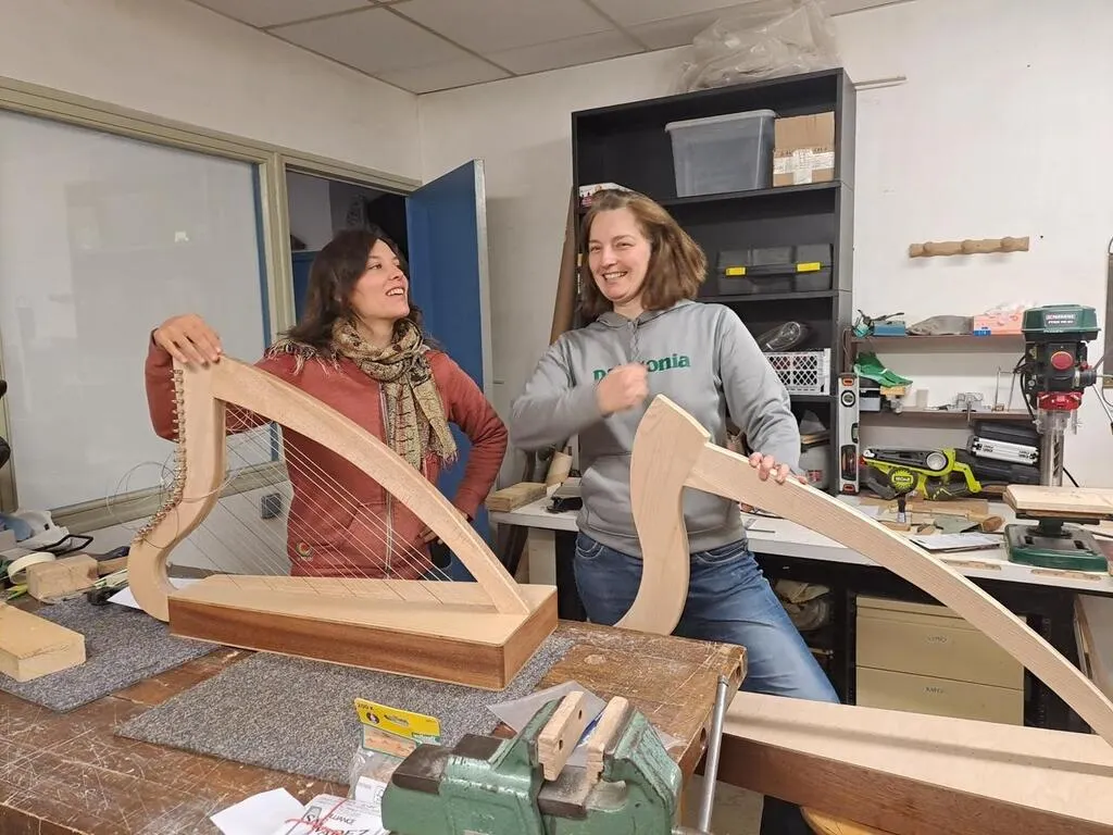 Dans son atelier, Suzann Chuchollek, luthière au Centre du patrimoine de la facture instrumentale, au Mans, accompagnée de Célestine Doedens, harpiste de Bretagne. © Suzann Chuchollek