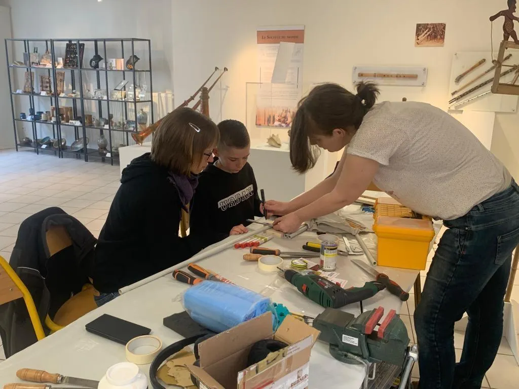 Susann Chuchollek sur un atelier de fabrication d'une flûte de Pan. Suzann Chuchollek