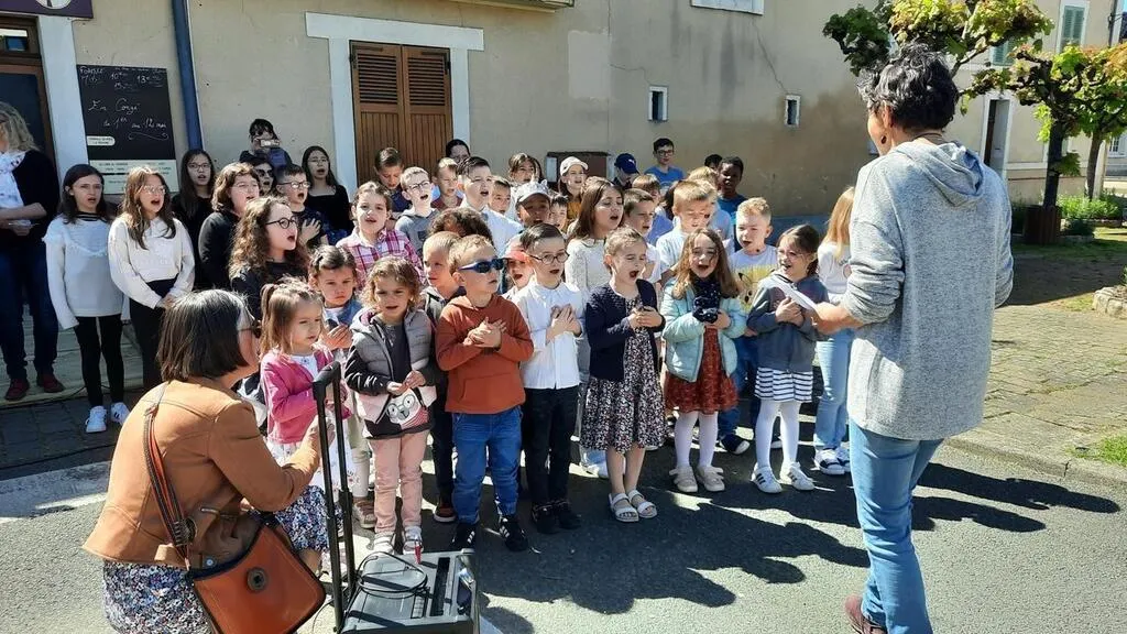 Les enfants ont déclenché l’émotion en interprétant, la main sur le cÅ“ur, le « Chant des partisans » lors de la commémoration du 8-Mai 1945, à Luché-Pringé (Sarthe). © Ouest-France