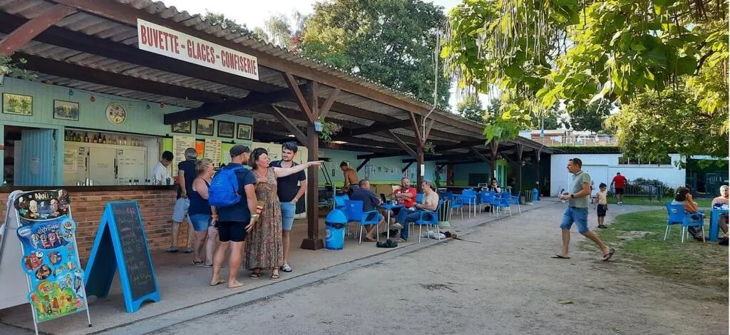 À la base de loisirs, le camping fait le plein, la piscine est prise d’assaut et la plage accueille familles, amis et campeurs autour des tables du bar.