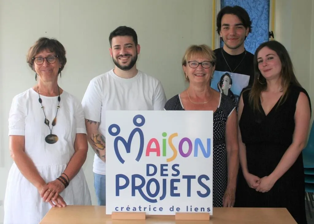 De gauche à droite : Isabelle Livache, directrice de la Maison des projets, Andréas Chryssopoulos-Boudet, directeur adjoint, Annick Gosnet, présidente de l’association, Amandine Barreau, chargée de communication et Hugo, stagiaire en communication. © Le Maine Libre
