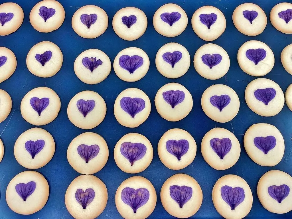 Ils sont très mignons avec leurs pétales violets en forme de cœur au centre. Des petits sablés de la Maison Drans agrémentés de Mauves de Mauritanie ont été créés à l’occasion de l’événement Entre cours et jardins, qui a lieu les 12 et 13 octobre 2024 au Mans (Sarthe). « La symphonie des sens, la thématique de l’événement mettant à l’honneur les plantes, m’a inspirée », relate Alexandra Pelletier, cogérante de la biscuiterie de Sablé-sur-Sarthe.
