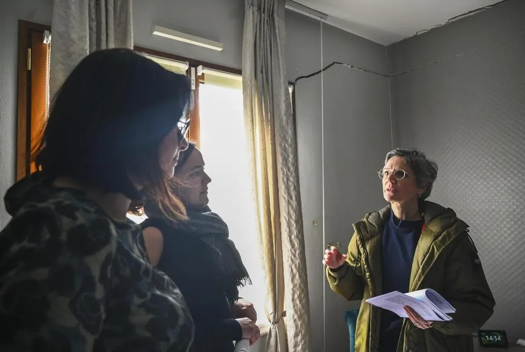 Le 17 mars 2023 Sandrine Rousseau, députée (EELV) à Pruillé-le-Chétif chez des riverains sinistrés par les fissures dans leur maison. archives Le Maine Libre Denis Lambert
