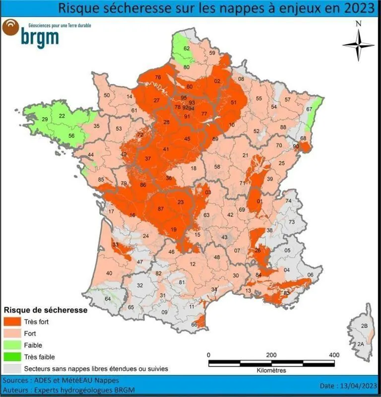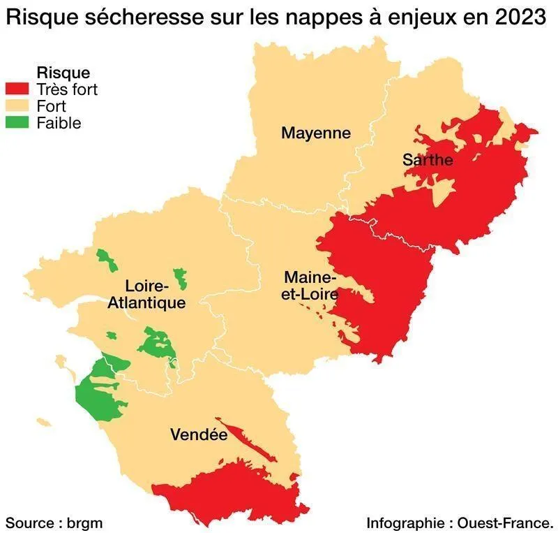 Le Bureau de recherches géologiques et minières, basé à  Orléans, a dévoilé, mi-avril 2023, une carte des régions qui pourraient être les plus touchées par la sécheresse l’été prochain. La Sarthe serait la plus impactée des cinq départements ...