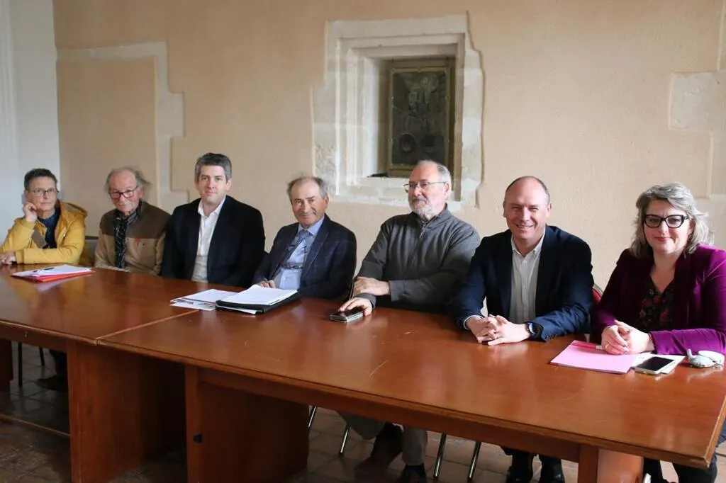 Gabriel Plou, (4e à droite), accompagné des membres du bureau, de Frédéric Beauchef et Stéphanie Colin-Beaufils, (à droite). © Ouest-France