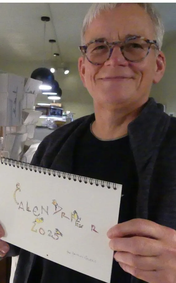 Pour cette fin d’année après une expo de ses aquarelles de voyage reproduisant son road trip de deux mois en Europe, elle a créé son calendrier 2025 avec douze de ses aquarelles très différentes selon les mois, bien sûr reliées au temps et à l’humeur de Katrin, des perce-neige en hiver puis les tulipes, les coquelicots, avant le muguet et voilà les rouges-gorges, et tellement de choses à découvrir comme les coups de pinceaux venant fleurir des jours spécifiques.