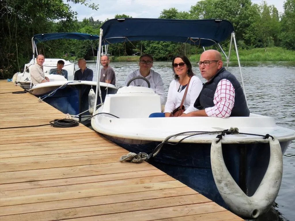 Ils ont pris place à bord, lors de l’inauguration du ponton le 5 juillet 2023, les élus locaux et représentants de l’office du tourisme Vallée de la Sarthe aux côtés de Jean-Yves Bellet et Magalie Souchard-Lehoux. © Ouest-France