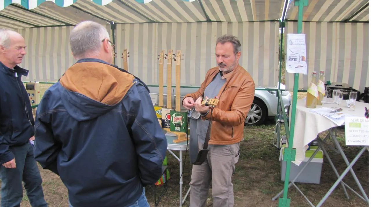 Lors de la fête bio qui s’est déroulée dimanche, un créateur de guitaresavec des bidons d’huile a fait une démonstration devant le public. © Ouest-France