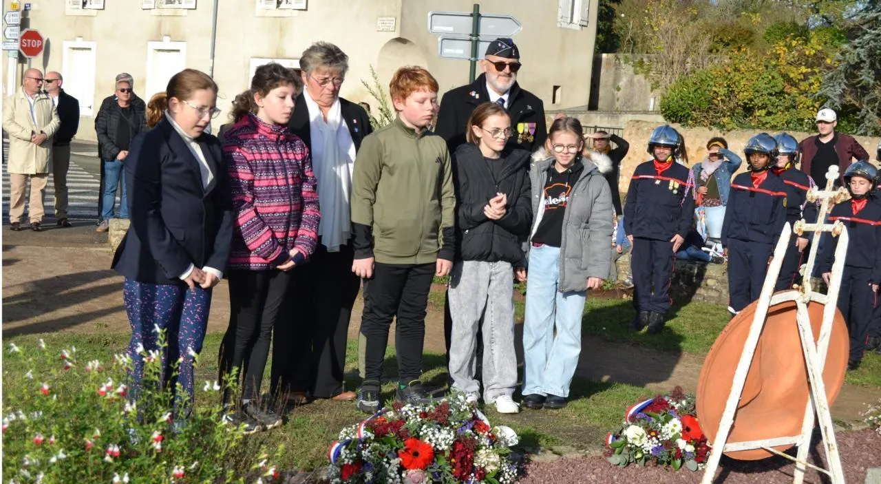 Des écoliers ont déposé les gerbes au monument aux Morts. © Le Maine Libre