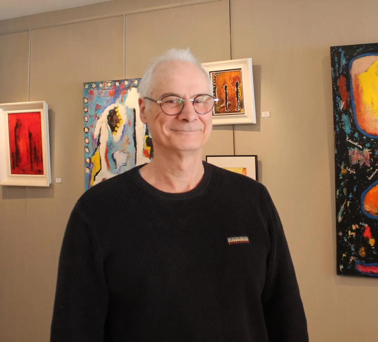 Christian Schmitt devant quelques-unes des Å“uvres exposées au sein de l’espace artistique de l’office de tourisme. © Le Maine Libre
