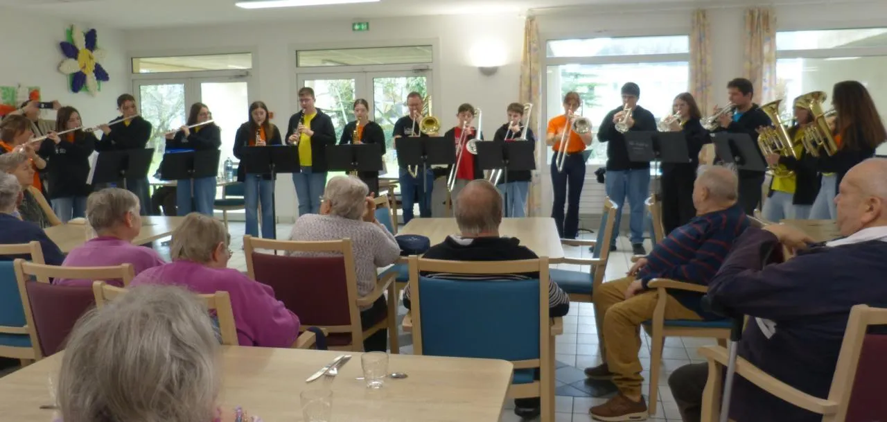 Mercredi en fin de matinée dans le cadre d’un partenariat avec l’École de Musique et Danse Maine Saosnois, l’Orchestre à l’école du collège Mauboussin a offert un concert aux résidents de l’Ehpad de La Dive. Une bonne trentaine d’entre eux était présente dans la salle commune pour profiter de ce moment de détente en guise d’apéritif.  Nos résidents sont toujours enchantés de ces animationsÂ