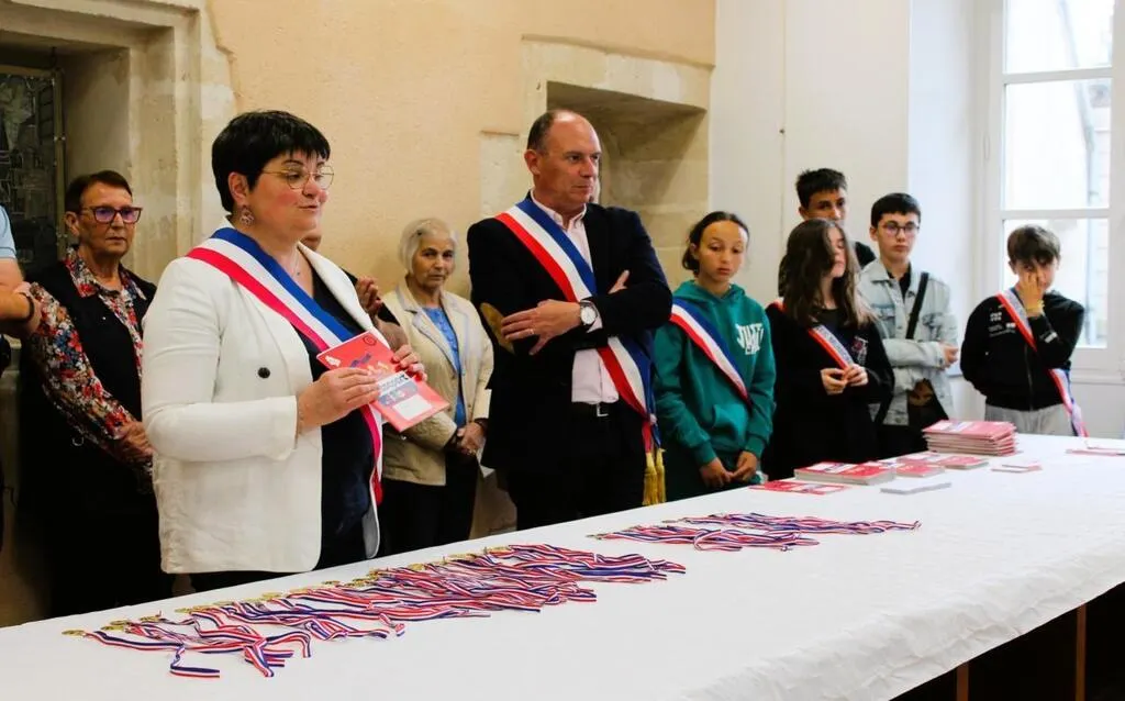Les médailles, diplômes et mémos répertoriant les numéros d’appel d’urgence aux services de secours ont été remis par la municipalité aux jeunes citoyens. © Le Maine Libre