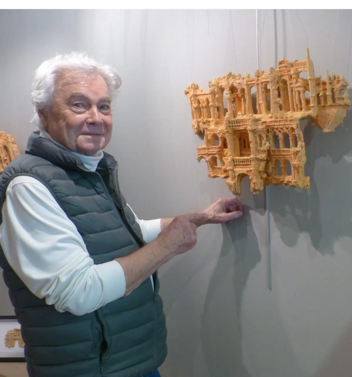 L’artiste sculpteur plasticien, qui vit aujourd’hui à La Chapelle-Montligeon, aurait pu être architecte. Ingénieur pendant une quinzaine d’années en Afrique, la nostalgie de l’architecture occidentale le conduit à passer une partie de ses soirées à peindre des aquarelles d’après ses souvenirs.  De retour en France j’ai abandonné ce métier d’ingénieur et j’ai suivi des cours d’architecture à l’École des Beaux-Arts de Montpellier. J’ai découvert le travail de la terre cuite et je me suis mis à reproduire des détails architecturaux de monuments en miniature. Très vite mon travail a intéressé des institutions (communes, départements) mais aussi des architectes notamment en Amérique du Sud. J’ai eu alors l’occasion de présenter des expositions dans le monde entier pendant une bonne trentaine d’années. Pour réaliser mes œuvres je m’inspire de l’architecture de tous les siècles, je reconstitue des façades imaginées en faisant une synthèse de détails pris sur plusieurs monuments (temples antiques, lieux de culte, hôtels particuliers…) et particulièrement des ouvertures.