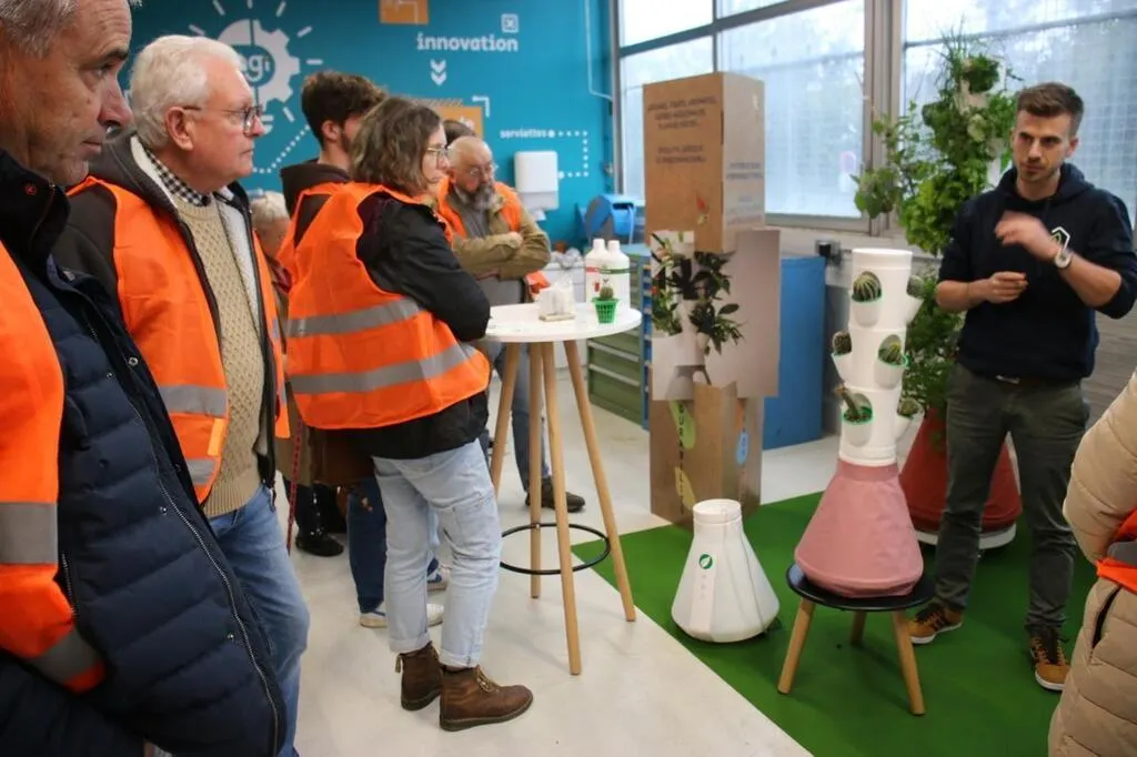 Matthieu Meunier, chargé de recherche et développement, (à droite), présente aux visiteurs un Home Potager avec plantes grasses. © Ouest-France