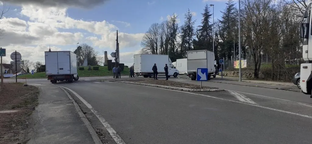 Une délégation de forains a bloqué ce mardi 21 mars 2023 l’accès à Mamers depuis la route d’Alençon, coupée dans les deux sens. La gendarmerie est intervenue. © Le Maine Libre
