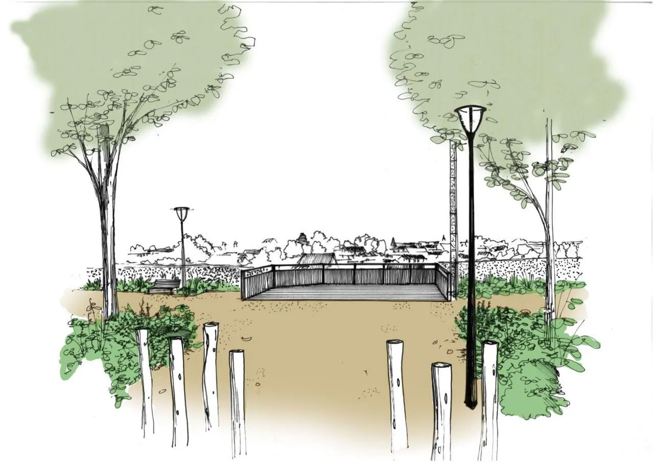 Perspective du belvédère, devant le parvis du complexe culturel Saugonna. Cabinet Feuillle à Feuille