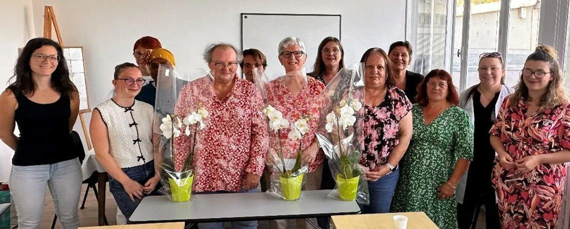 Entourées de leurs collègues auxiliaires de vie, les jeunes retraitées ont reçu des plantes fleuries pour leur départ. © Le Maine Libre