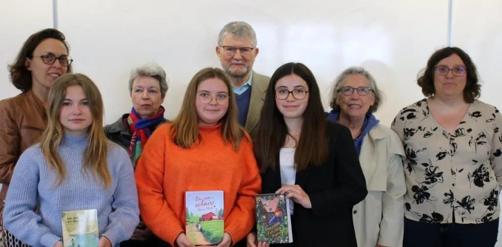 Les trois collégiennes lauréates du concours, accompagnés des enseignantes et membres de l’Amopa. © Ouest-France